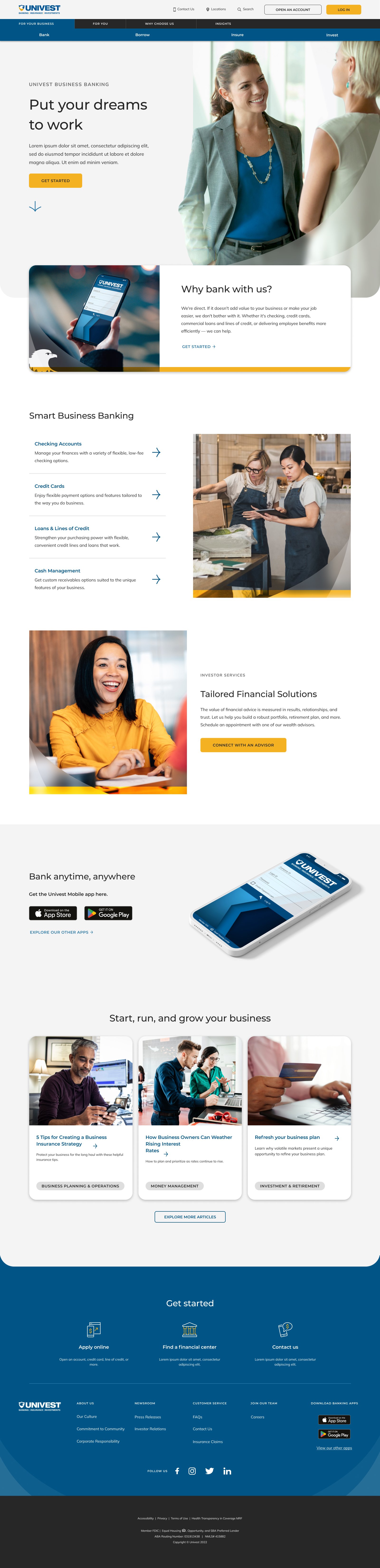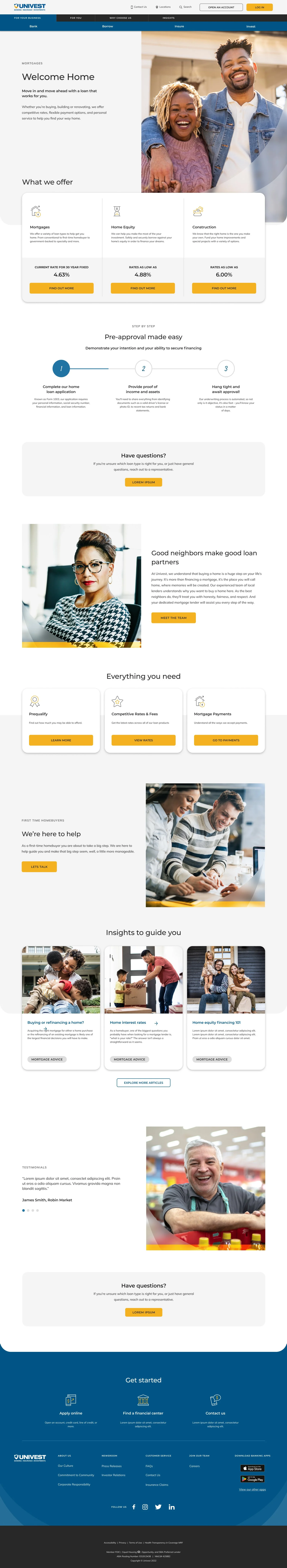 With Bounteous, I did a total redesign of Univest’s website. Even as a growing bank, Univest continues to show themselves in a community-minded way, and they wanted to keep a local feel to their redesign. We leaned into bringing in the design pieces they use at physical branches - frosted glass, curves, and their yellow accent color. We created custom icons and enhanced their brand system by providing guidelines for the use of their brand elements.